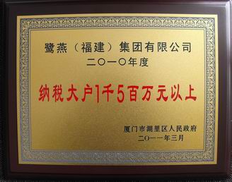 由厦门市湖里区政府举办的 “湖里区2010年度纳税先进企业”的评选名单已经正式揭晓,鹭燕(福建)集团有限公司榜上有名,获得了 “湖里区2010年度纳税大户1千5百万元以上先进企业”的荣誉称号。自2007年底搬迁至湖里区以来,我司已连续三年获此荣誉称号。