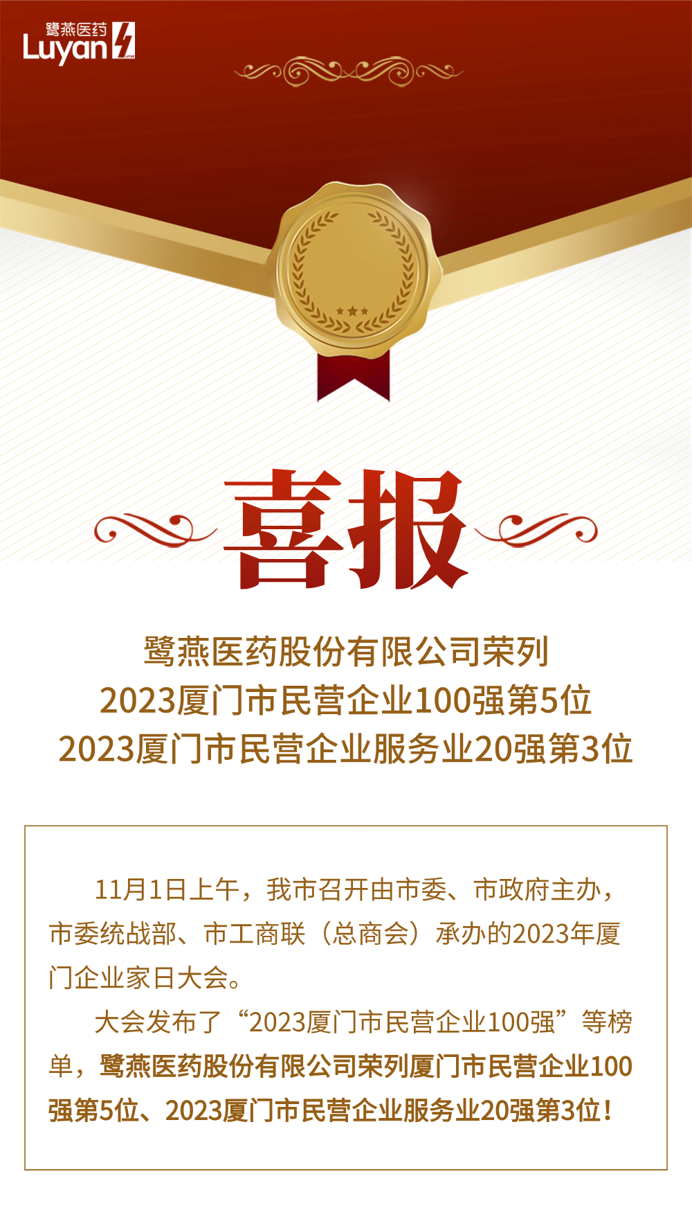 喜报 | 鹭燕医药荣列2023厦门市民营企业100强等系列榜单!