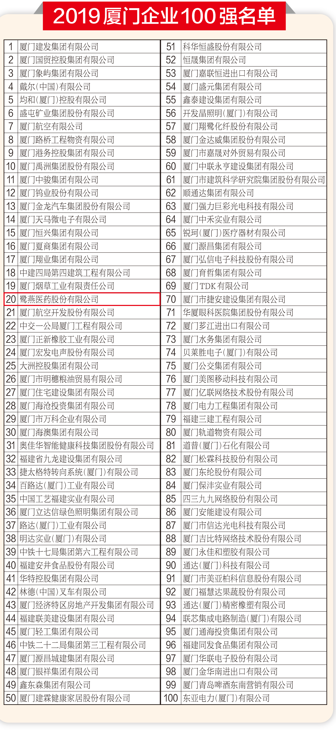 2019年8月6日,由厦门企业和企业家联合会、厦门日报社、厦门广电集团联合主办的“2019厦门企业100强”排序工作圆满落幕,华体会hth·(体育)(中国)官方网站 (以下简称“鹭燕医药”)从厦门几十万家企业中脱颖而出,荣耀登榜第20位,这是鹭燕医药连续第14年入选厦门百强榜单。