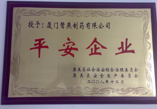 近日,集美区召开了“2008年度平安企业”表彰大会,厦门鹭燕制药有限公司从几百家参评企业中脱颖而出,获此殊荣。
