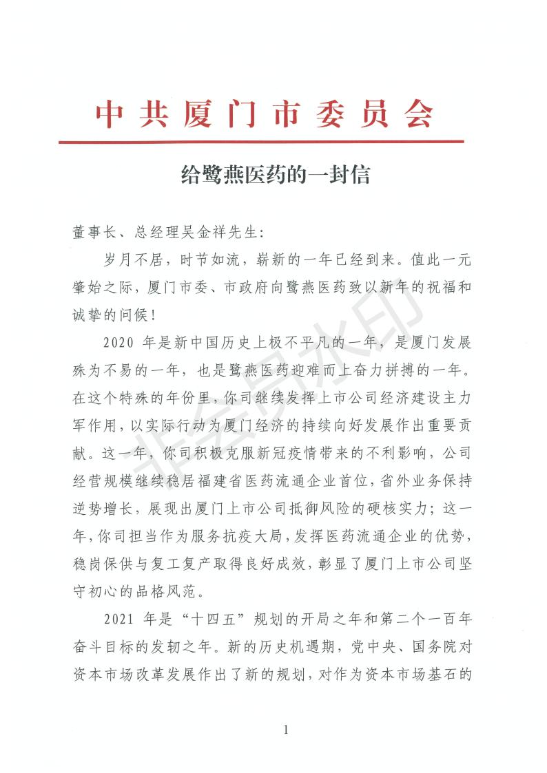 新年伊始,华体会hth·(体育)(中国)官方网站 收到一封来自厦门市委、市政府的信。信中,厦门市委、市政府向鹭燕医药致以新年祝福与诚挚问候,并对鹭燕医药一年以来迎难而上、奋力拼搏、发挥上市公司经济主力军作用、为厦门经济持续向好发展所作出贡献予以高度肯定并寄予厚望。