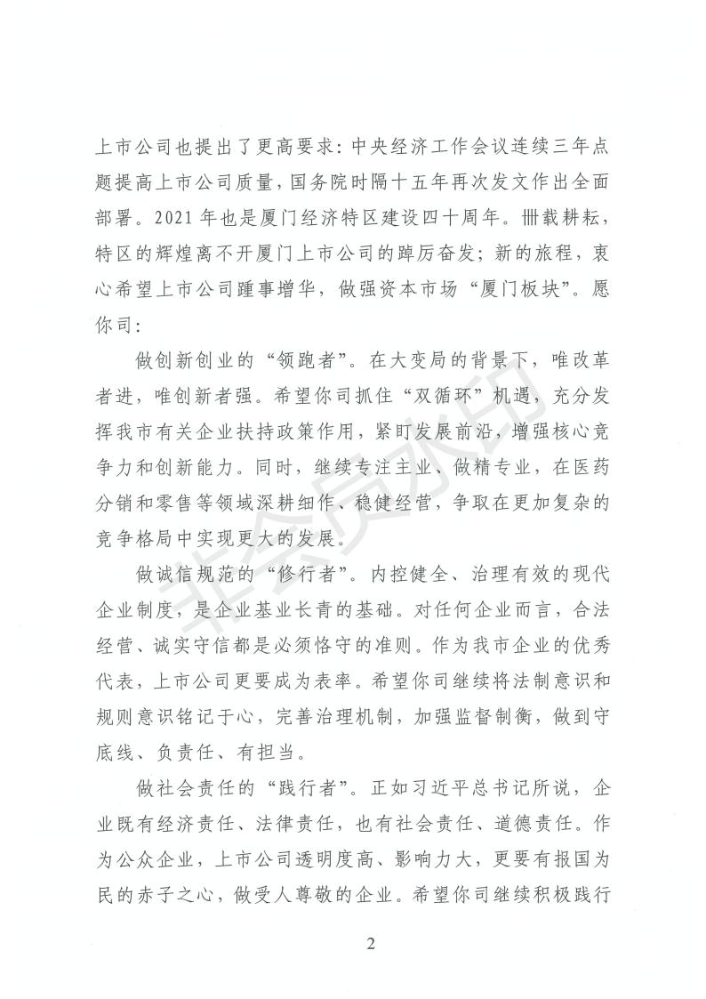 2020年是极为不平凡的一年,鹭燕医药克服新冠疫情带来的不利影响,经营规模继续稳居福建省医药流通企业首位,省外业务保持逆势增长,展现出厦门上市公司抵御风险的硬核实力;同时,担当作为服务抗疫大局,发挥医药流通企业的优势,稳岗保供与复工复产取得良好成效,彰显了厦门上市公司坚守初心的品格风范。