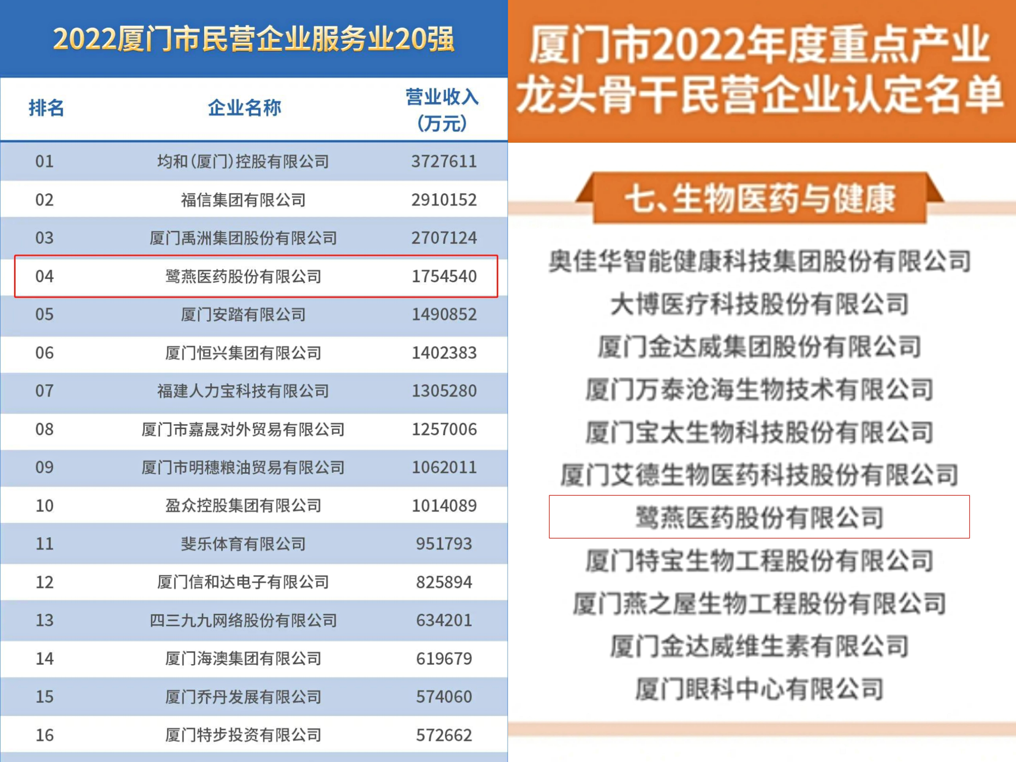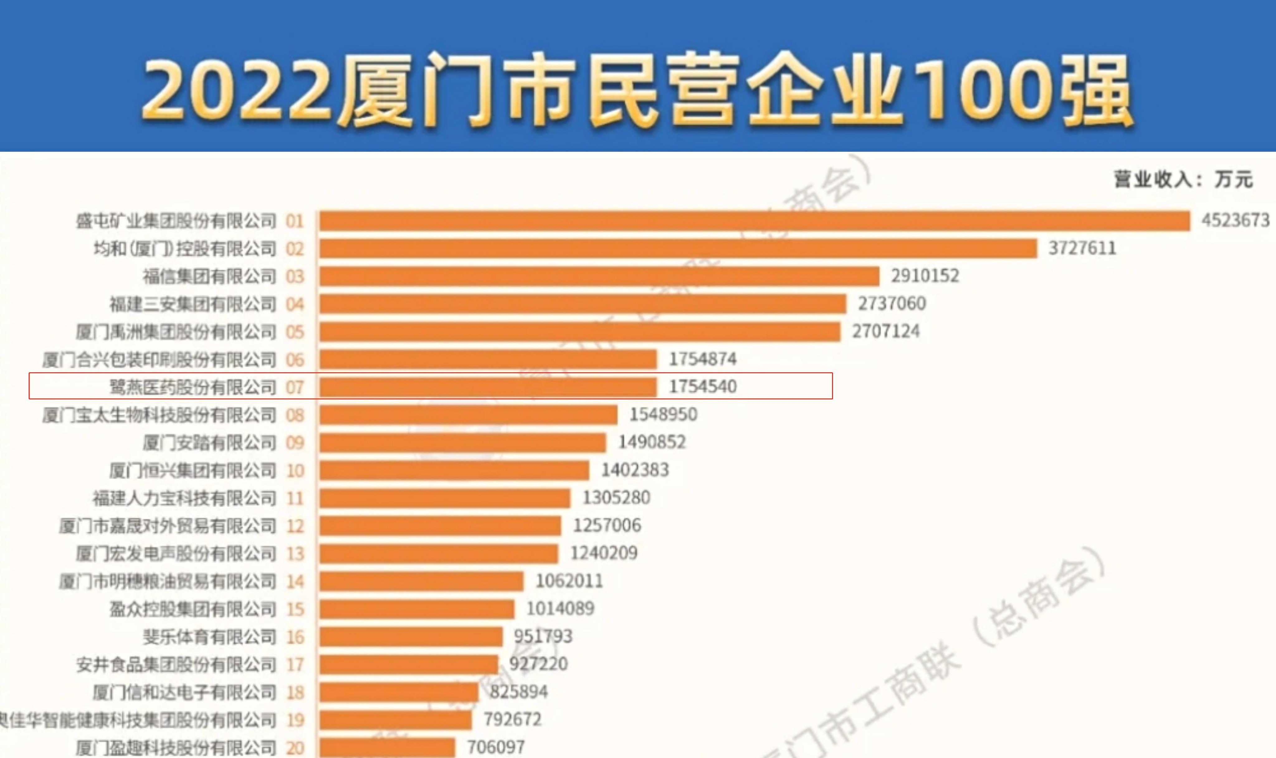 鹭燕医药位列“2022年厦门市民营企业100强榜单”第7位