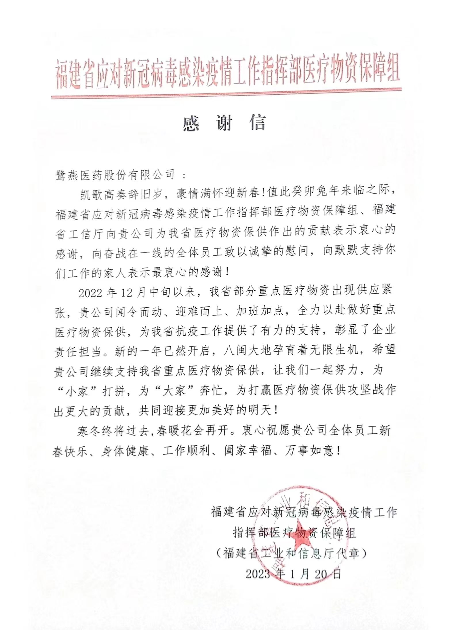 鹭燕医药收到来自福建省应对新冠疫情工作指挥部的感谢信