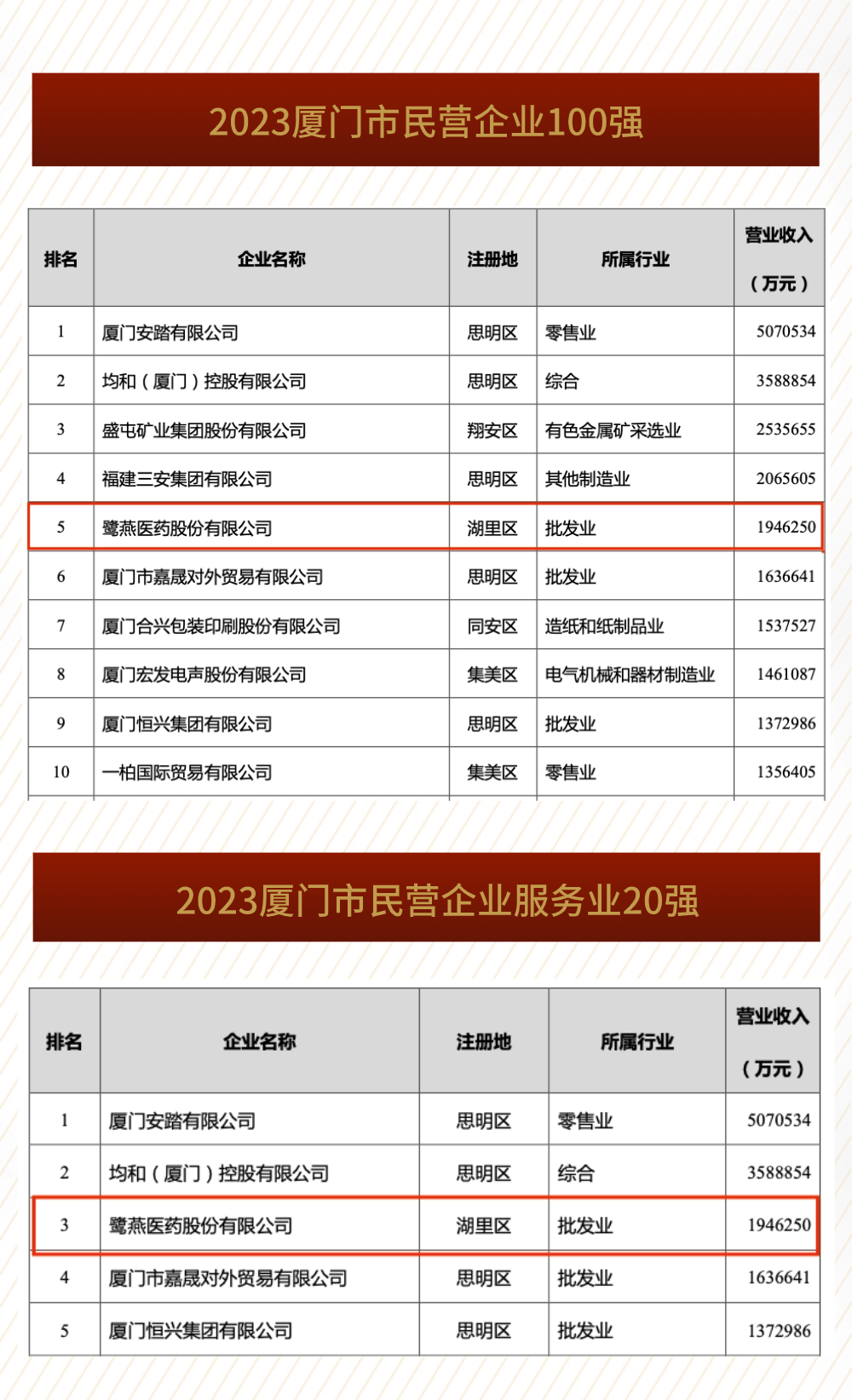 2023厦门企业百强揭晓,鹭燕医药荣列第16位!
