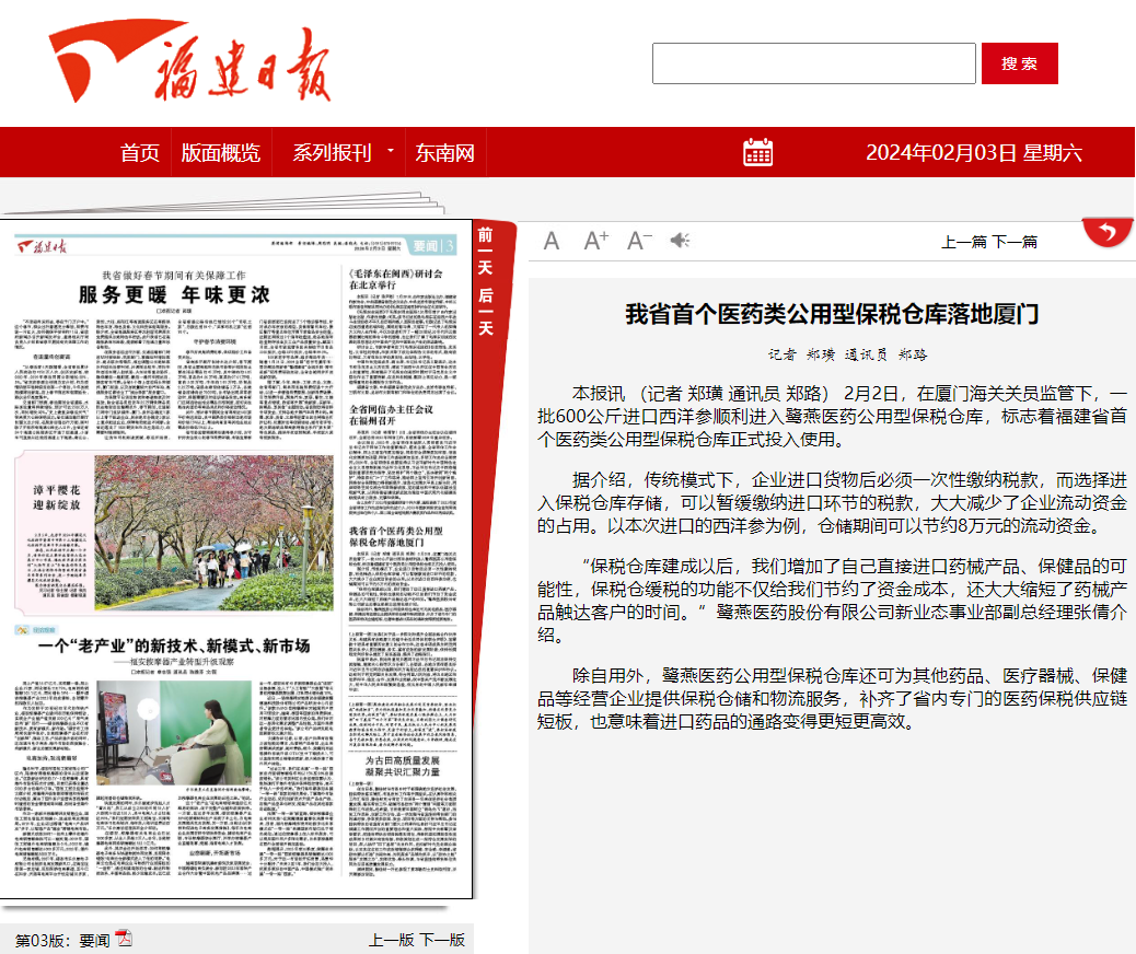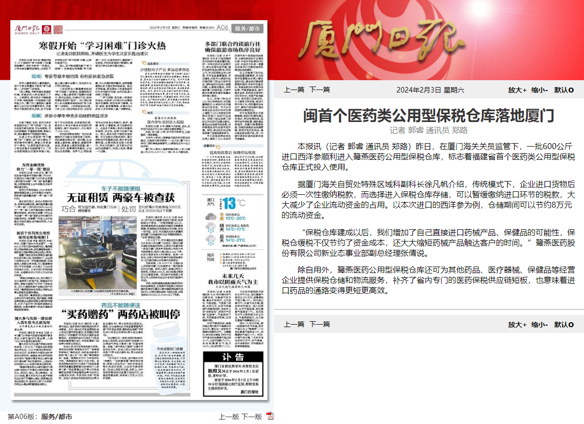 2024年2月2日,鹭燕医药公用型保税仓获批投用,《福建日报》《厦门日报》相继报道相关新闻。鹭燕医药公用型保税仓是福建省首个医药类公用型保税仓库,该保税仓库的投用,意味着厦门市乃至福建省补齐了区域内专门的医药保税供应链物流服务,也意味着厦门和福建进口药品的通路变得更短,更为高效。