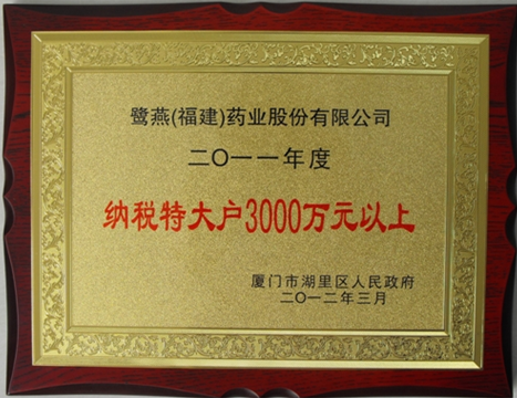近日,厦门市湖里区隆重召开2011年度纳税先进企业表彰大会,鹭燕(福建)药业股份有限公司以超3000万的突出纳税贡献荣获“2011年度厦门湖里区纳税特大户”称号。